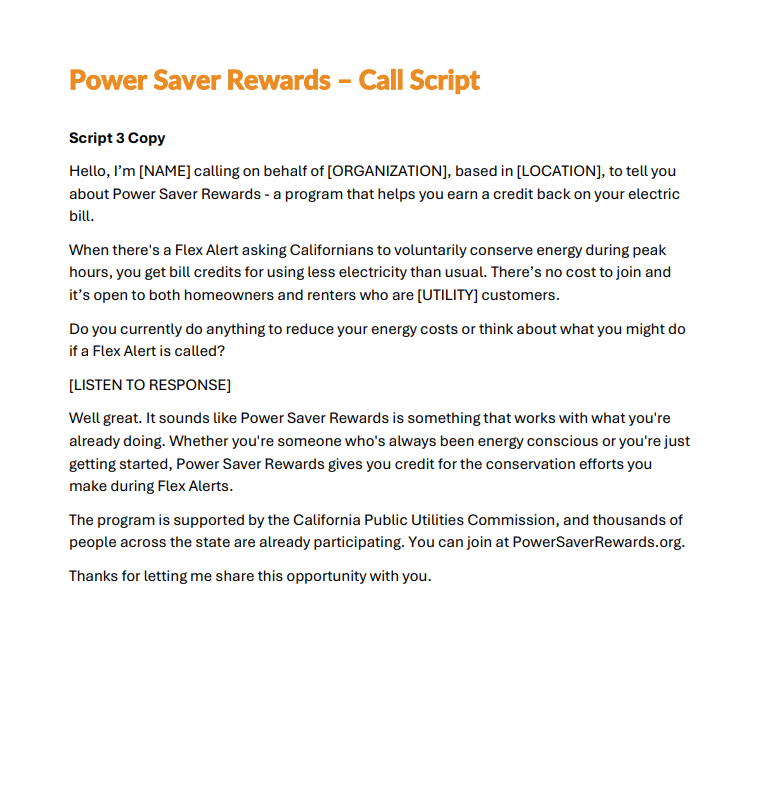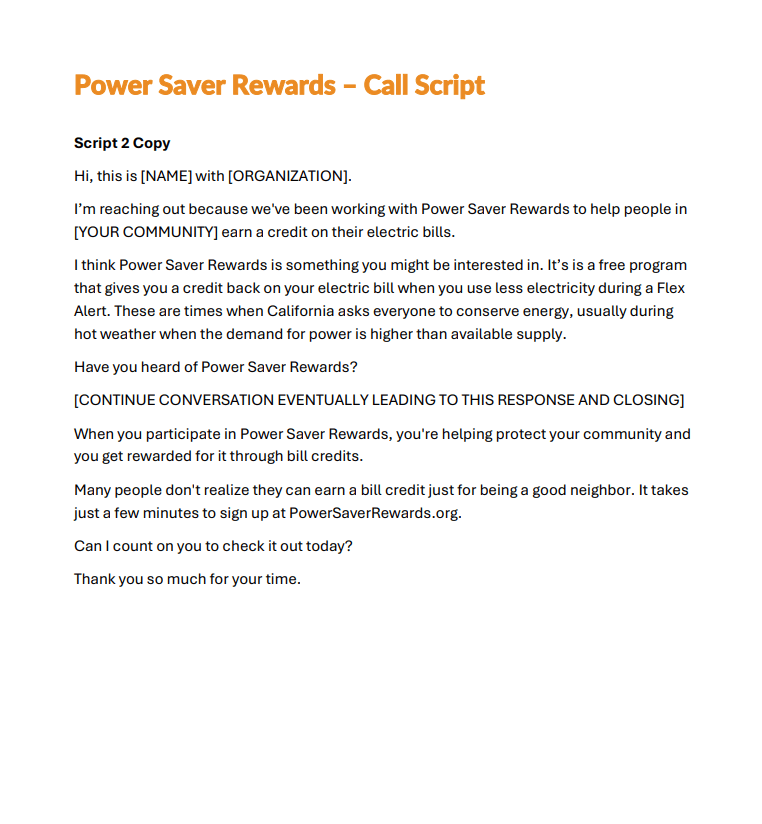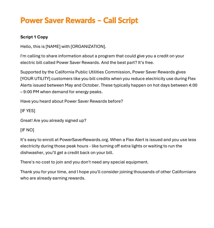 Please click below to download an call script to be used for general Power Saver Rewards awareness.