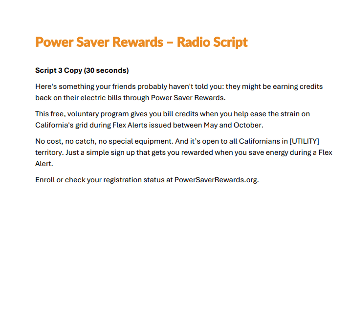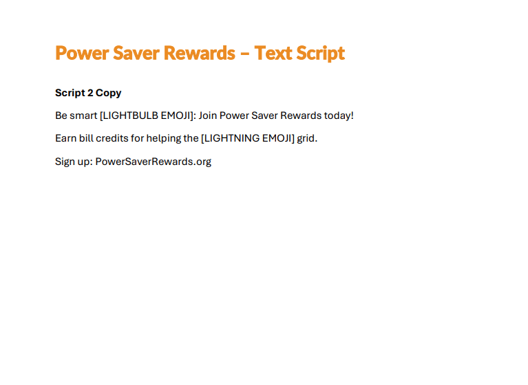 Please click below to download an text script to be used for general Power Saver Rewards awareness.