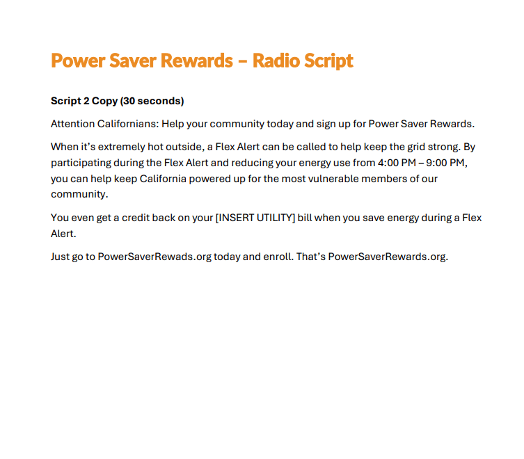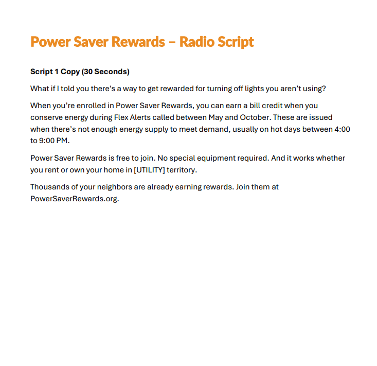 Please click below to download a radio script to be used for general Power Saver Rewards awareness.